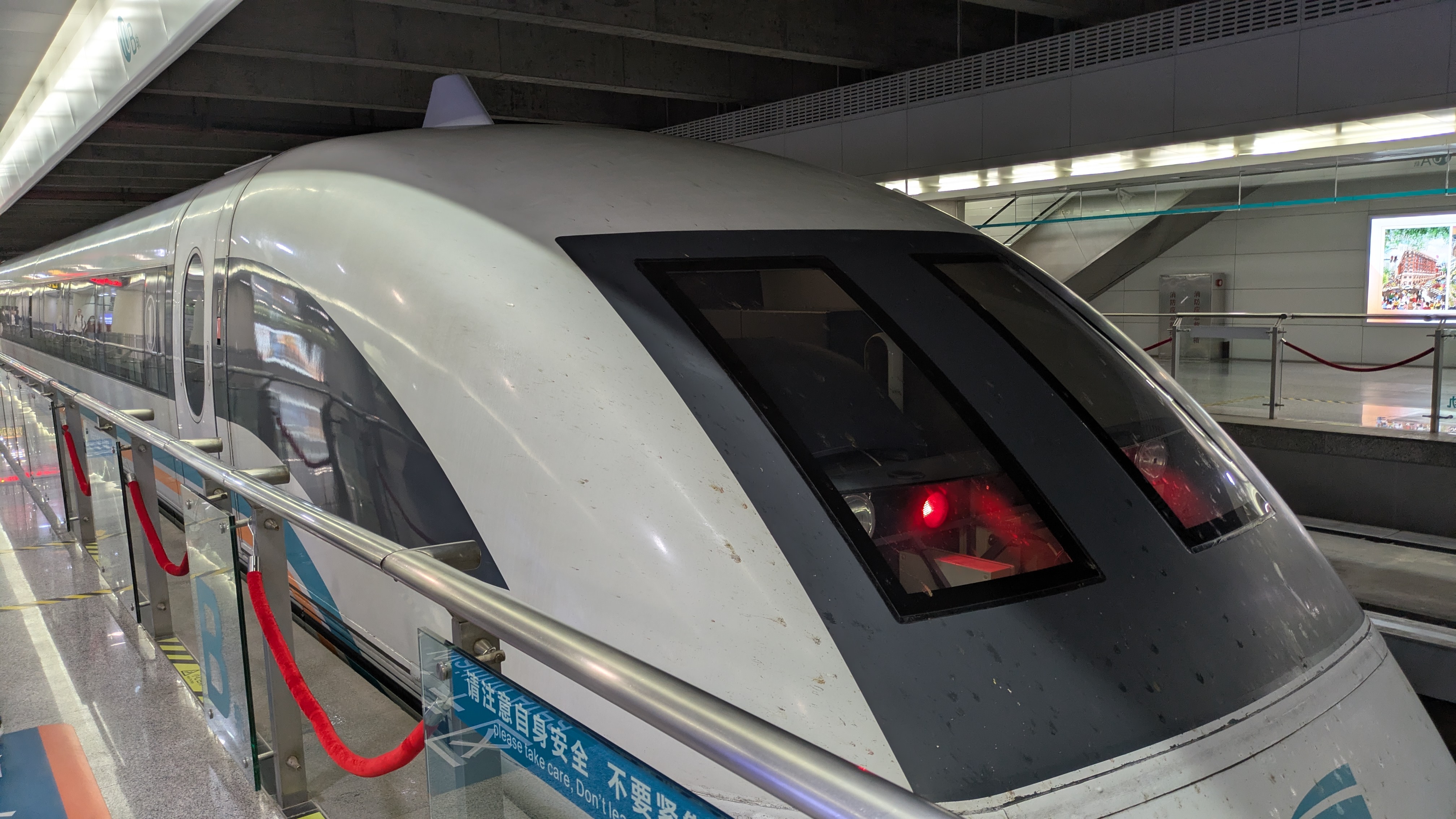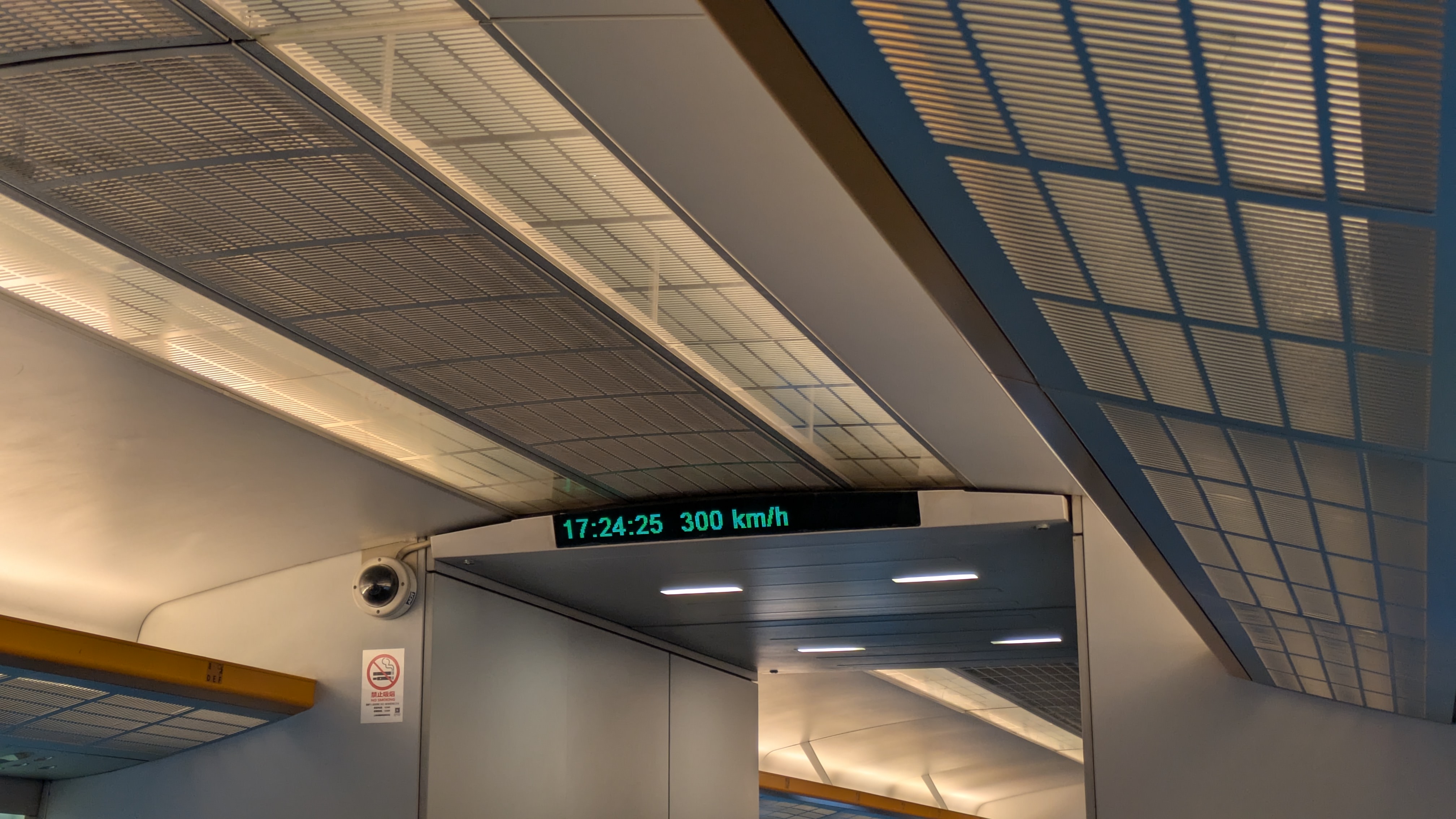 浮いているので揺れは速度の割には感じません。最高速度は300km/hです。社内に表示があるので最高速度が出ていることがわかります。 カーブでは減速しないためにかなり車体が傾いているなと感じました。