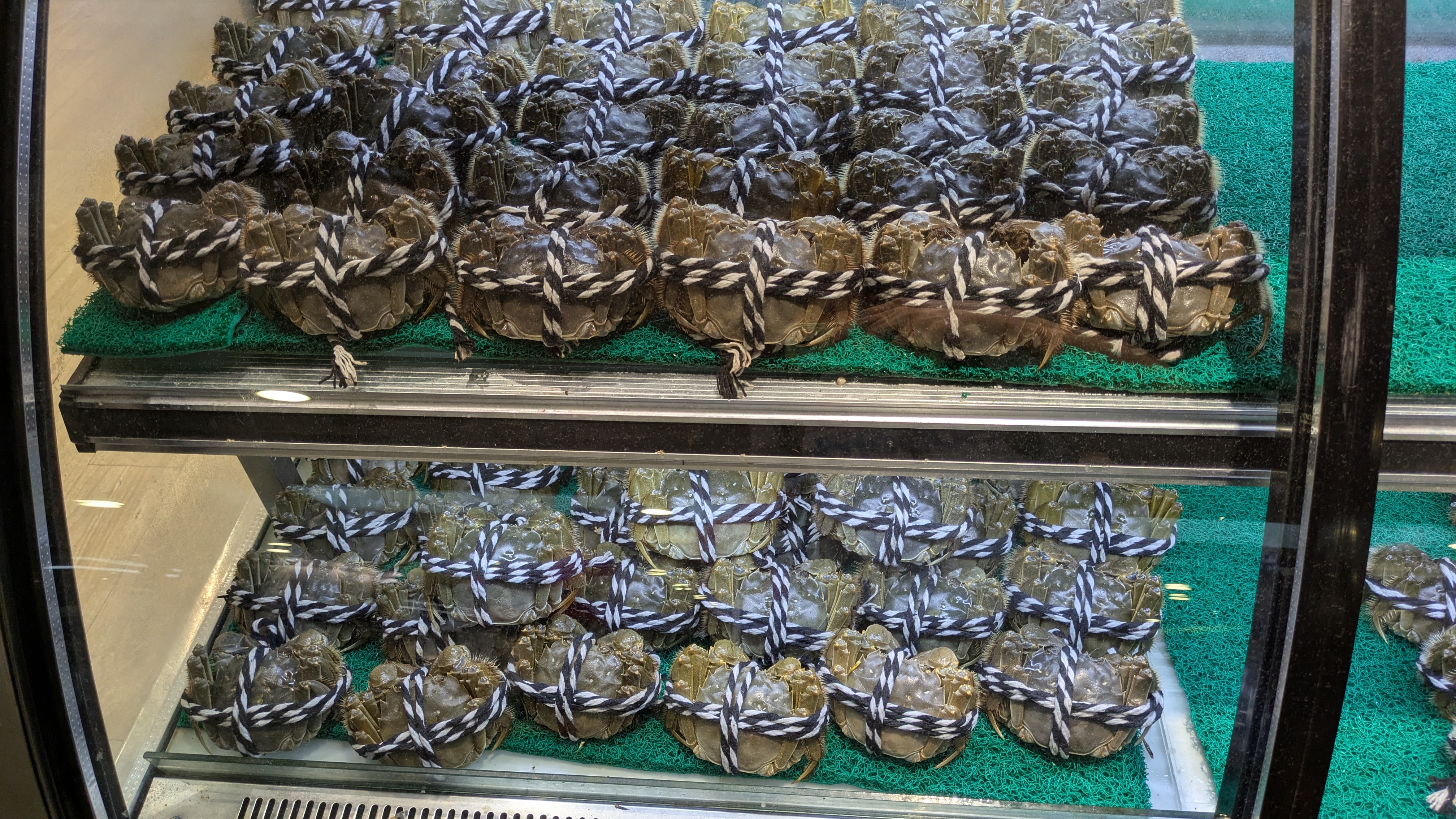 その後、電車を乗り継いで上海空港に到着し、スムーズに出国検査を受けて制限エリアに入りました。 すると目の前に「上海蟹」のショーケースがありました。 空港で上海蟹を売ってるんですね、さすが上海。