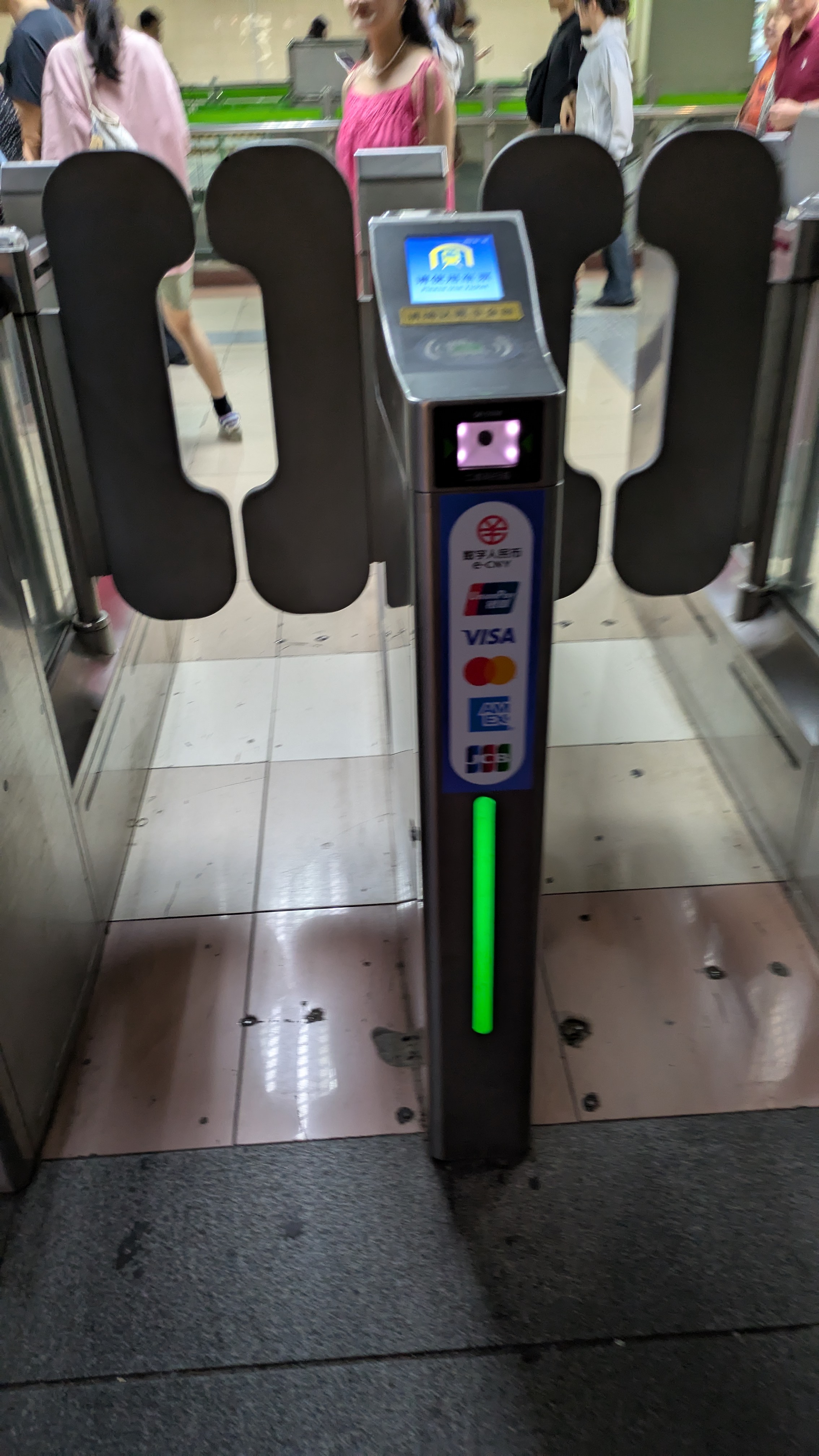リニアモーターカーを降りたら地下鉄を乗り継いでホテルの最寄り駅まで移動します。 上海では駅に入るときに必ず荷物検査があります(めんどい)。 suicaみたいなカードどこで買えるんだろう?と思いながら荷物検査を通ってキョロキョロしていると、地下鉄の改札に見慣れたクレジットカードのマークが見えました。 これはもしや?と思ってスマートフォンをかざすと、クレジットカード決済で改札が開きました!! これは旅行者にとってはめちゃめちゃ便利です。