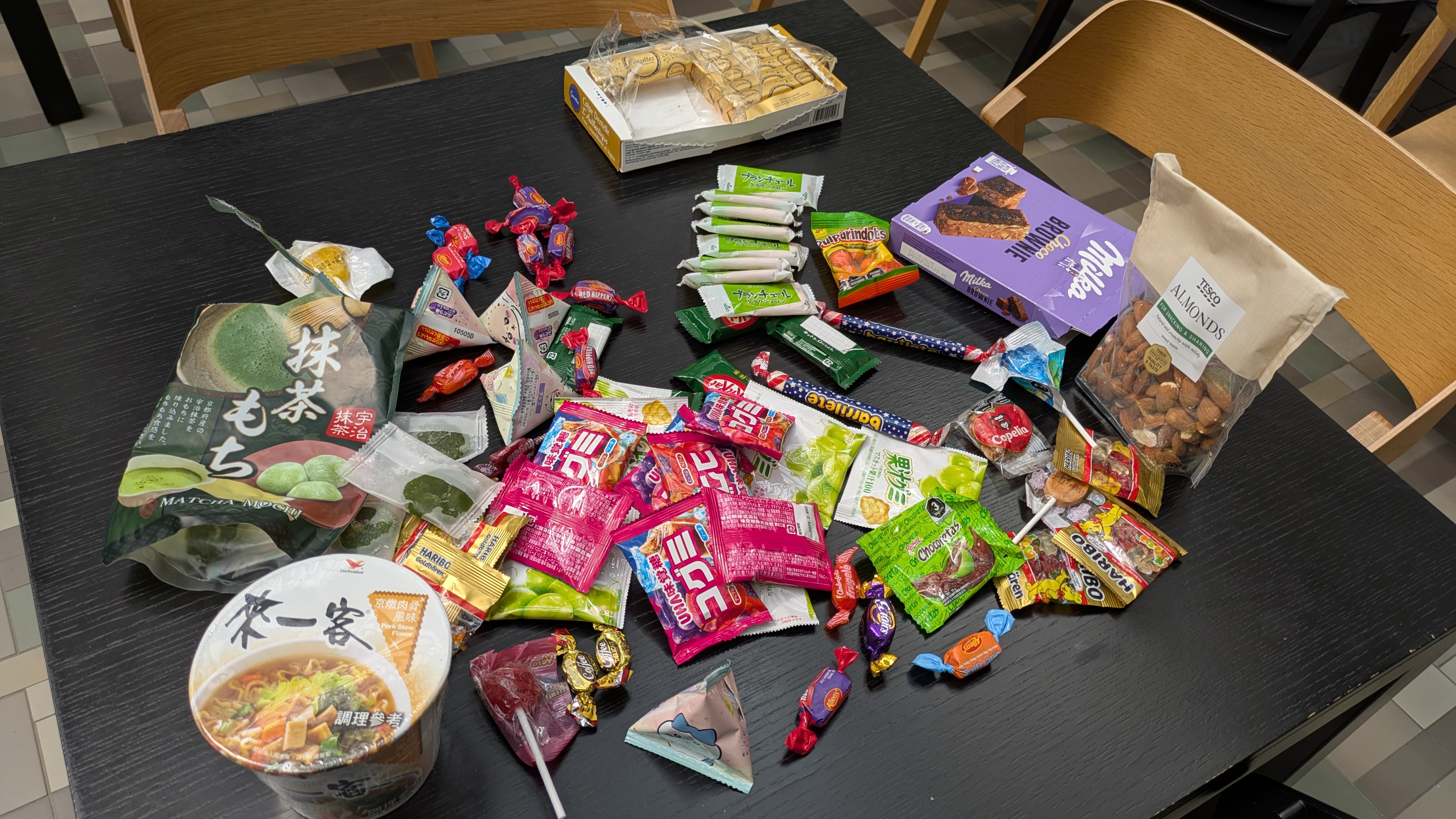 会場に到着したら主催の方にあいさつしてから「日本から持ってきたお菓子が余ったんだけど、お菓子用のテーブルを作れませんか?」とお願いしました。 手前側のテーブルにお菓子を置いてからDiscordで「Free Snackテーブル作ったよ」とお知らせしたところ、後でテーブルを見に行くと各国のお菓子が増えていました。 ちなみに、写真にある「抹茶もち」は筆者が持っていったものではなく、ドイツの女性が日本に行ったときに買って帰ったものだそうです。 「もち大好き」って言ってました。