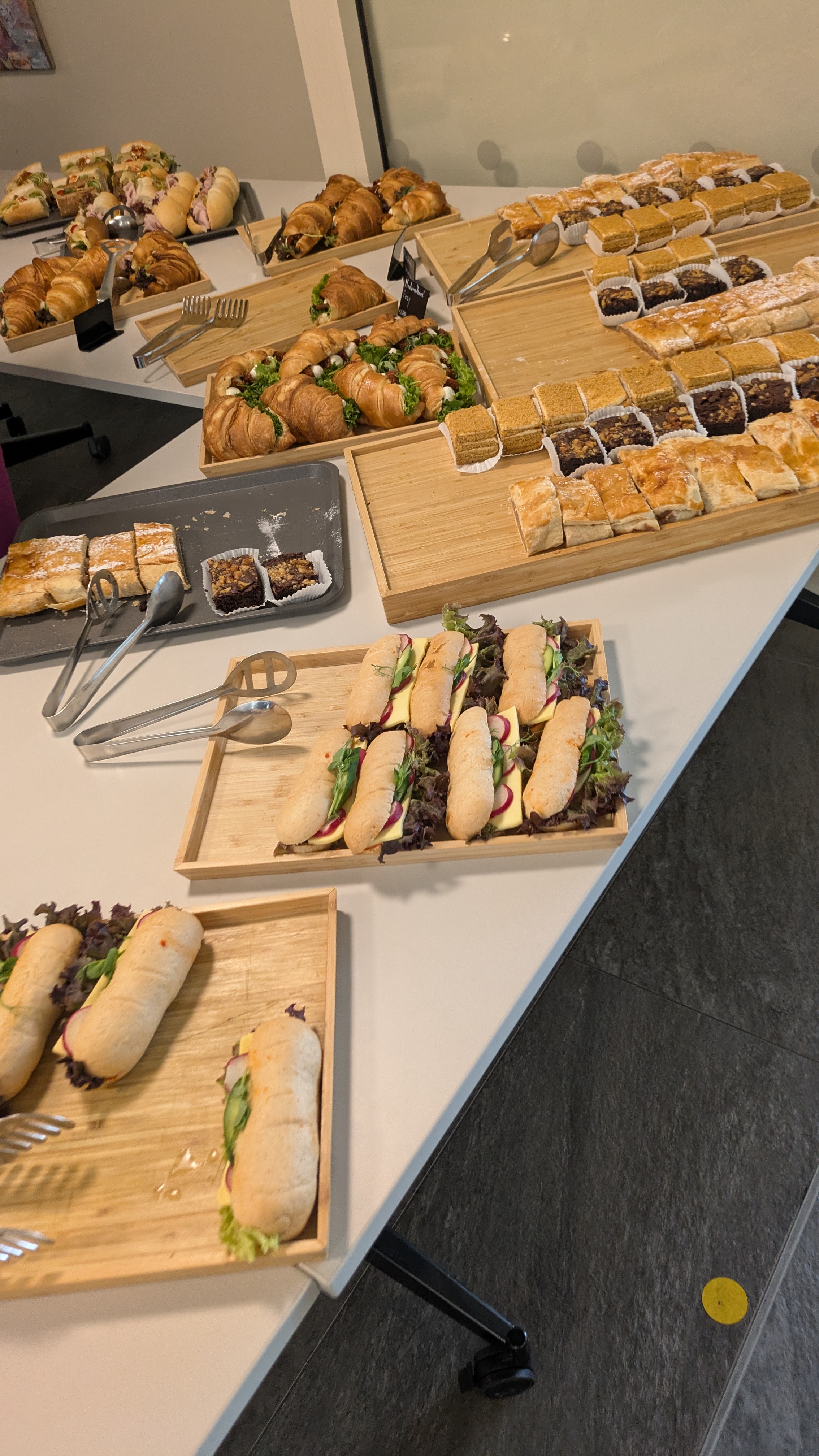 スプリント会場では11時過ぎにお菓子とサンドイッチが並びはじめました。 Discordでの主催者からの説明によると、これはランチではなく「おやつ」だそうです。 パンにチーズが挟まっていたり、別テーブルでは小さなシュニッツエル(牛カツ)も提供されており、Discordでも「これランチじゃないの?」といったやりとりがされていました。 これがチェコ流なんでしょうか。 ただ、朝食を食べて来ていない筆者にはありがたかったです。